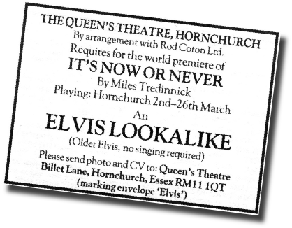 But the biggest challenge was finding someone to play ‘Elvis’. He had to look enough like the King himself to convince the audience he was the real thing whilst at the same time handle some tricky comedy routines on stage. Rod and Joe decided that the ‘search for Elvis’ might be a terrific publicity stunt and placed an ad in that week’s ‘Stage’ newspaper. All our play needed was the best Elvis lookalike in the country but would anyone be interested?